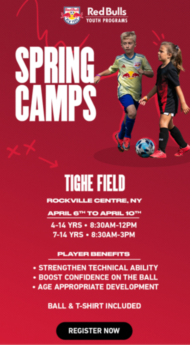 Rockville Centre Soccer Club is excited to host the New York Red Bulls Youth Programs Spring Camp this April at Tighe Field.